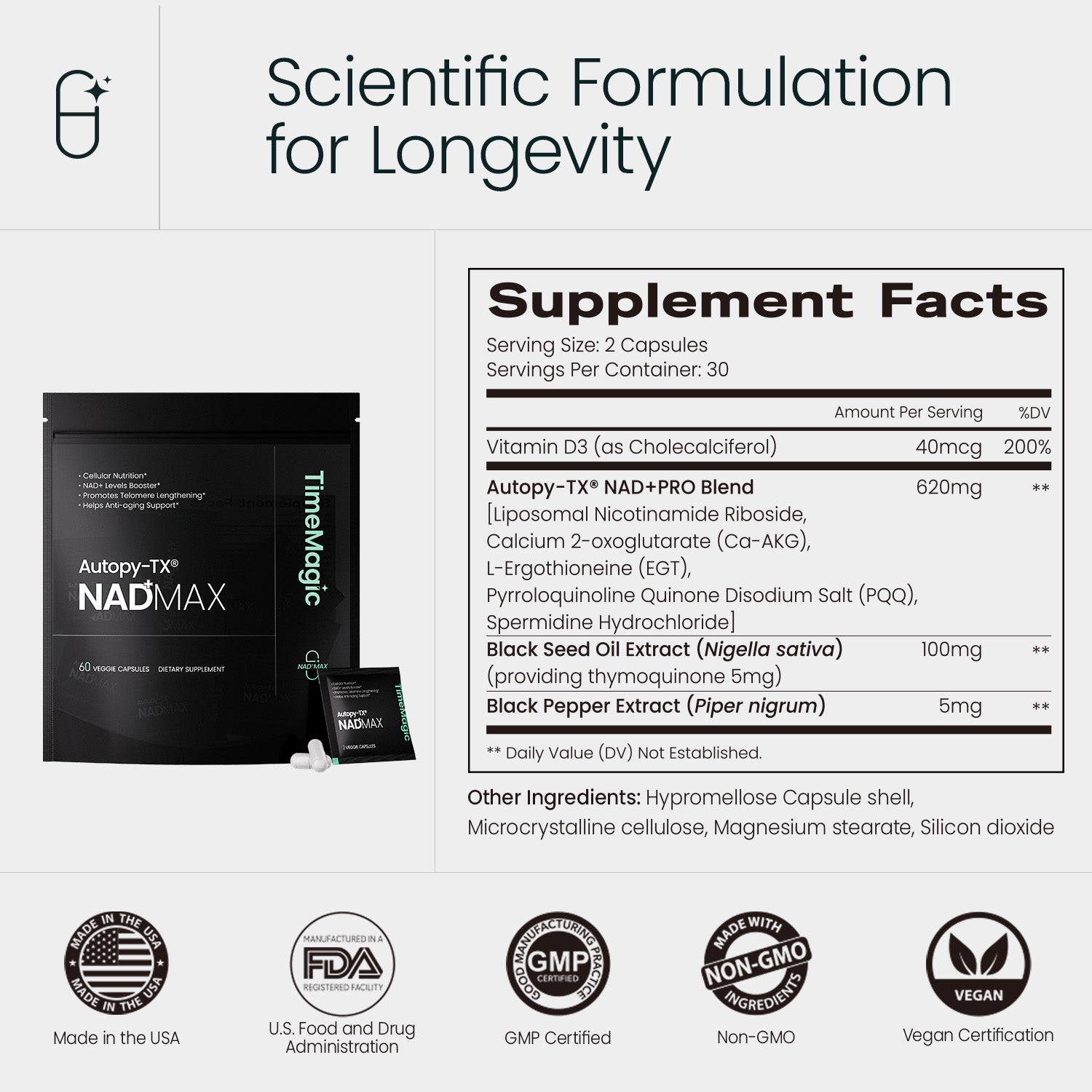 TimeMagic NAD+MAX was engineered to address these dimensions simultaneously: boosting cellular energy, restoring metabolic rhythm, activating autophagy, and rebalancing inflammation.